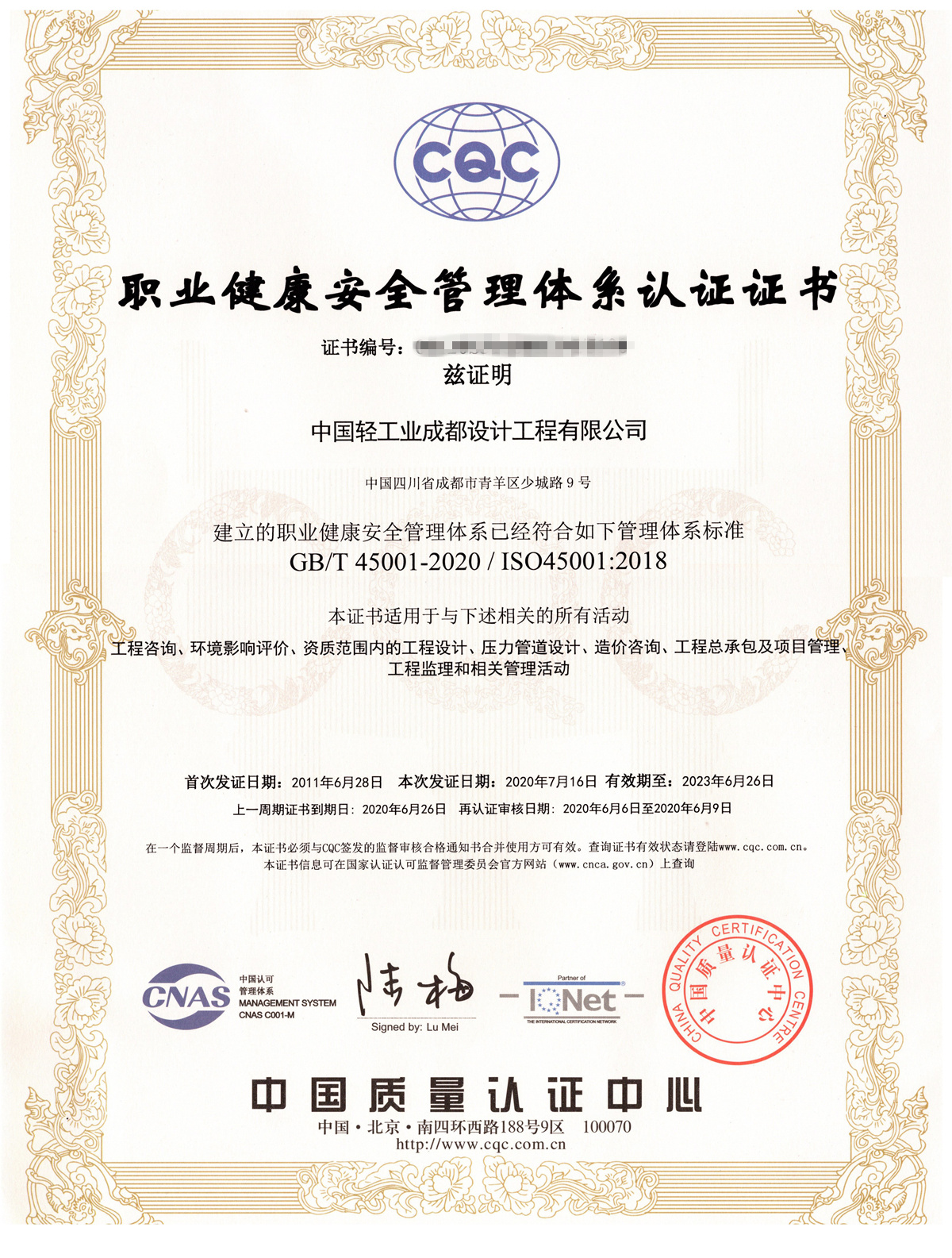 職業(yè)健康安全管理體系認(rèn)證證書